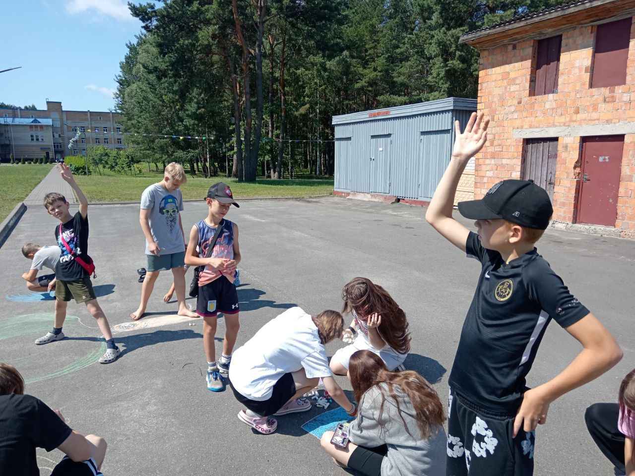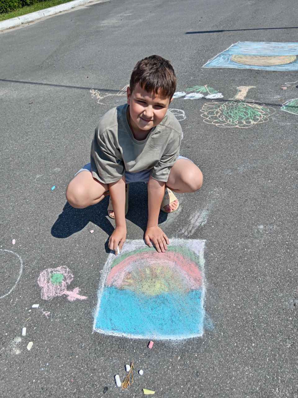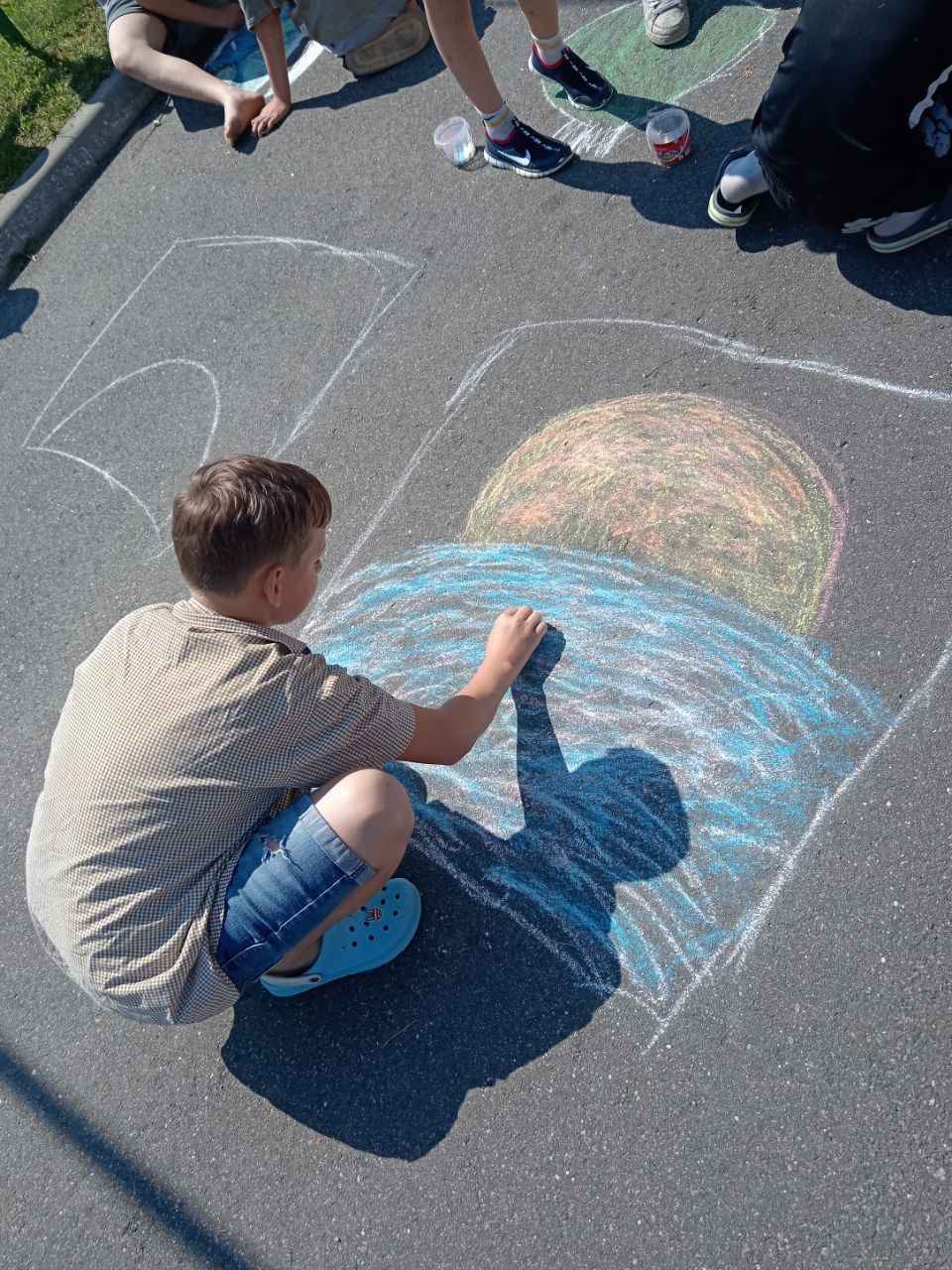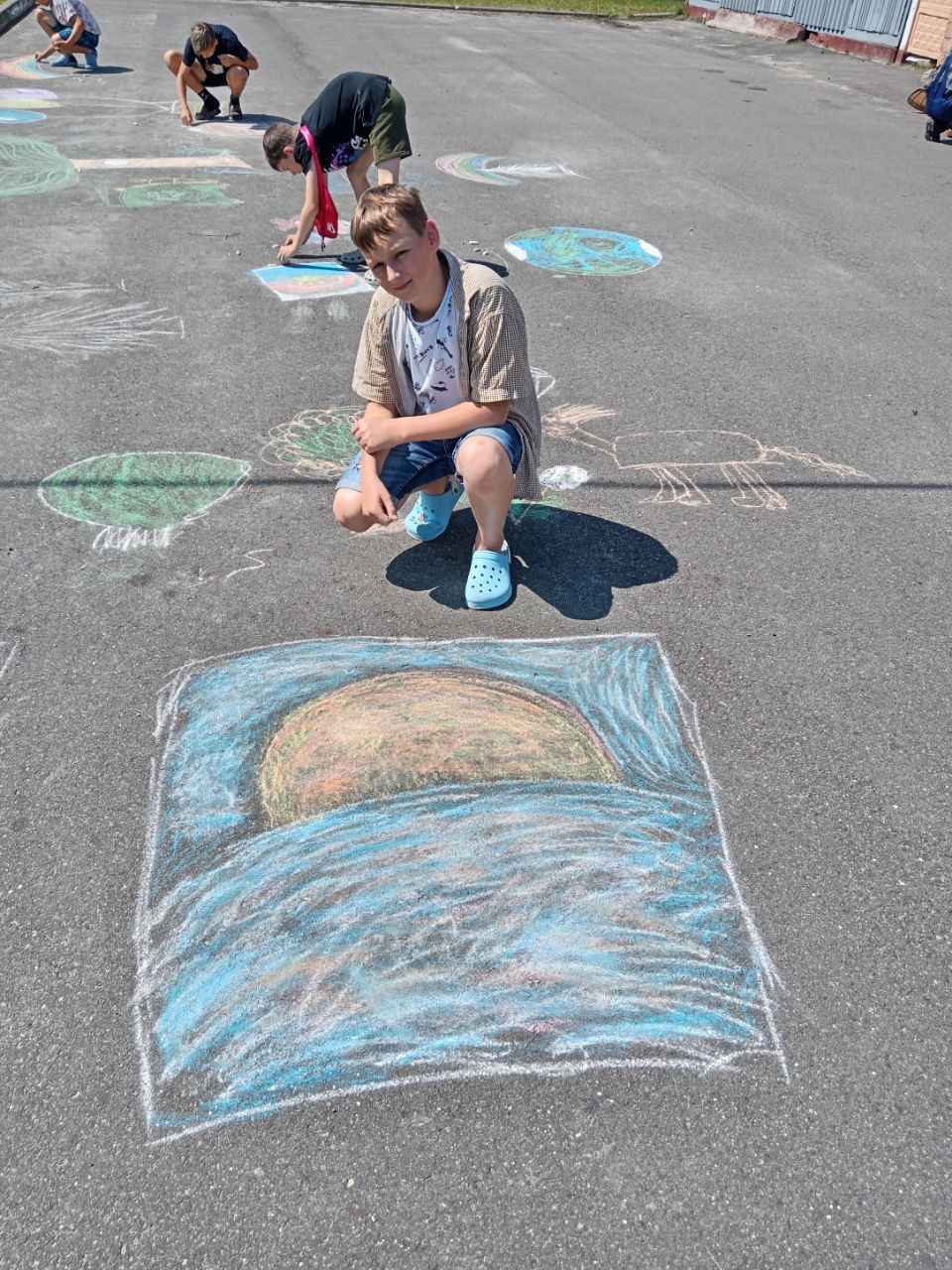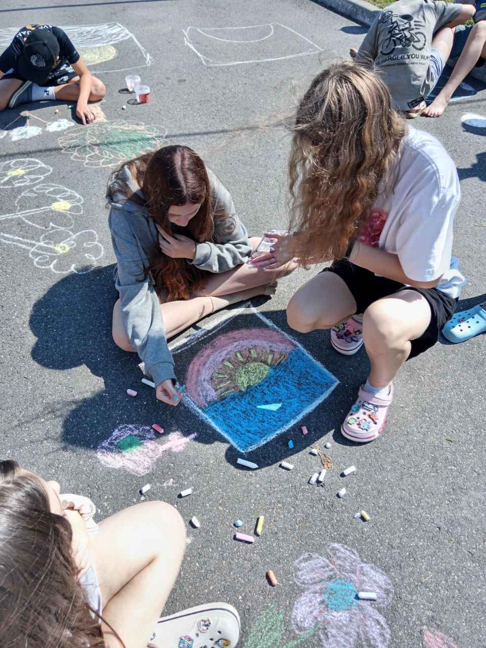Затем прошла интерактивная игра «Да — нет», где участники определяли, какие привычки помогают природе, а какие — вредят ей. Ребята с интересом реагировали, рассуждали и комментировали ответы. После этого дети творчески выразили своё отношение к природе: на асфальте появились яркие рисунки с деревьями, животными, солнечным небом и зелёными полями. Участники с удовольствием делились идеями и создавали «улицу природы».