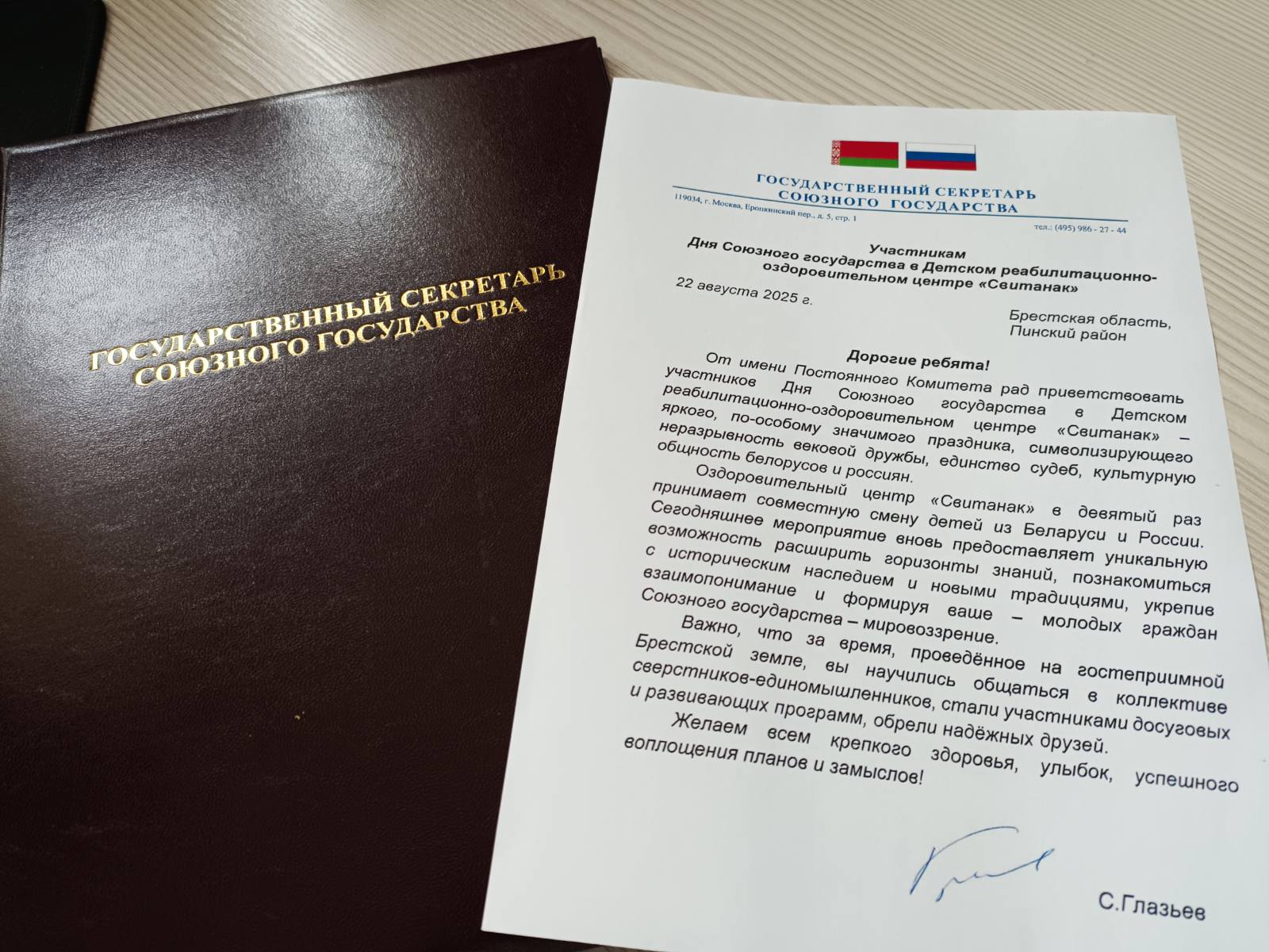 Приветственный адрес участникам Дня Союзного государства в КУП «ДРОЦ "Свитанак" от имени Государственного секретаря СГ С.Ю. Глазьева передала консультант представительства Постоянного Комитета Союзного государства в г. Минске Наталья Александровна Бурак.