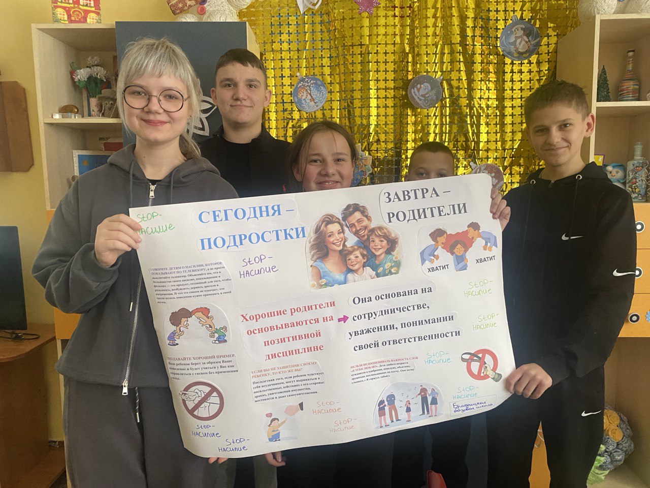 Сегодня во всех игровых комнатах Центра в профилактических целях был проведен информационный час « Скажем «Нет! Насилию!». Старшеклассники также подготовили коллаж «Сегодня - подростки, завтра - родители».